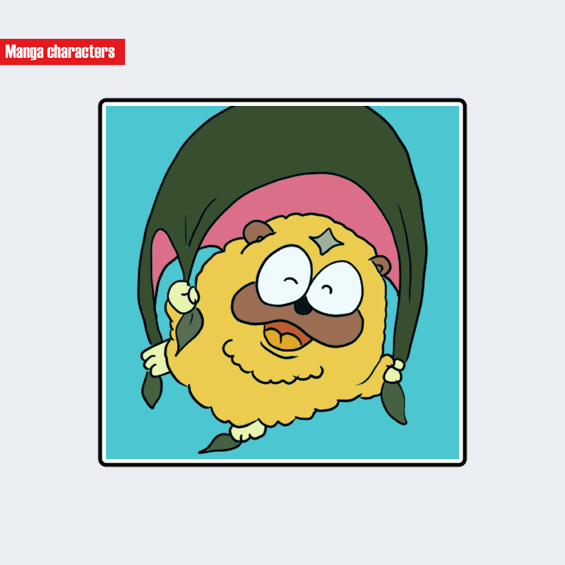 丸い体型と黄色い毛並みのキャラクターは他作品にも存在するが、ギザギザの毛輪郭と大きな楕円眼、加えて緑布を持つ構図が本キャラ固有の組み合わせであり、混同リスクは小さい。