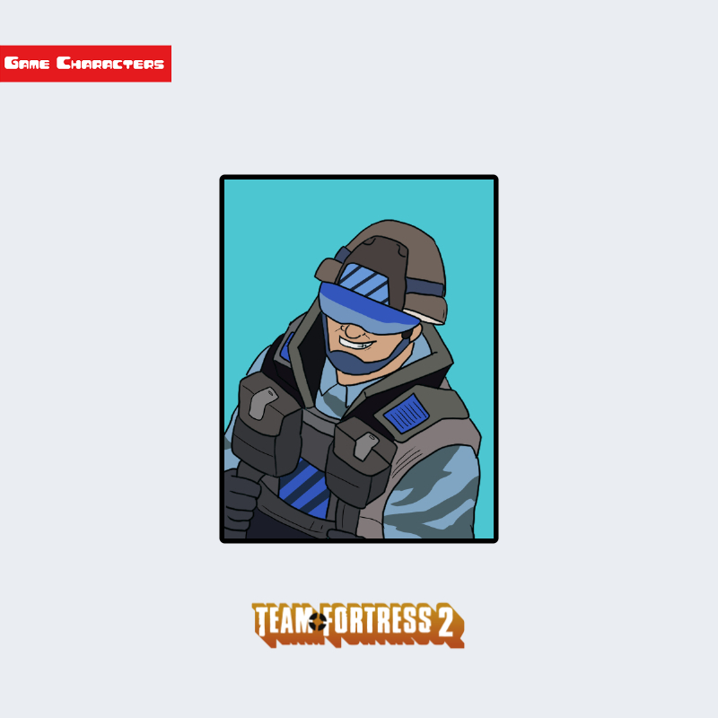 『Team Fortress Classic』に登場するデモマンは、戦闘用ベストと防護パッドを備えた重装構造の兵科キャラクターである。衣装は青を基調に、黒い装甲プレートと複数の弾薬ポーチを装着しており、爆発物専門職としての職能を視覚的に示している。頭部には保護ヘルメットとゴーグルが一体化した装備を着用し、顔の一部を覆うデザインが特徴。全体は「重装爆破型構造」に分類され、エンジニアやソルジャーよりも攻撃装備を強調した造形となっている。