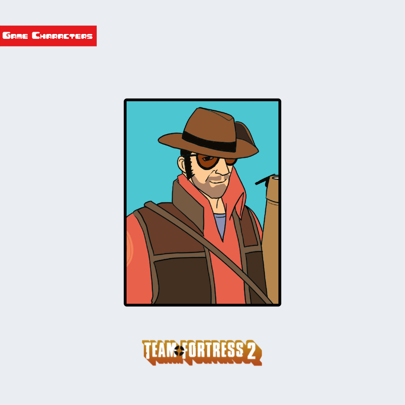 『Team Fortress 2』に登場するスナイパーは、ブラウンのハットとベストを着用したアウトドア風の衣装デザインが特徴である。赤いシャツに濃色のベストを重ね、肩からスリングベルトを斜めにかけている。首元には開襟シャツが見え、全体的に機能性を重視した「野外射撃型構造」に分類される。サングラスとハットの組み合わせは狙撃兵としての象徴的記号であり、シリーズ内の他兵科に比べ実用的な服装構成が際立っている。