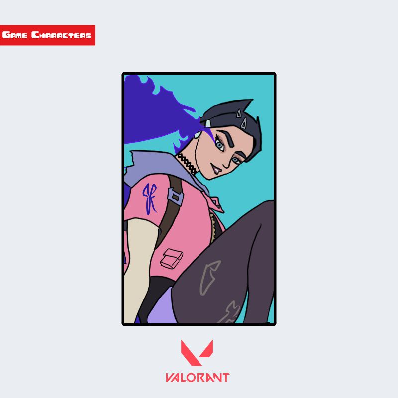 『VALORANT』に登場するクローヴは、カジュアルかつ戦闘対応型の衣装構造を持つキャラクターである。髪は鮮やかな青紫色で、後方に大きく流れるように束ねられており、動的印象を与える。上半身はピンクと黒のコントラストが際立つパーカー型ジャケットで、装飾として複数のストラップやポケットが付属している。袖やフード部分には異素材の切り替えが見られ、機能性重視の設計と推察される。構造分類としては「ストリート融合型戦闘衣装構造」に属する。