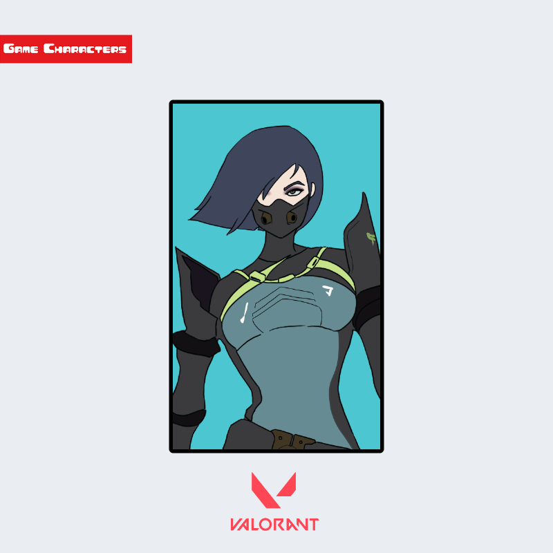 『VALORANT』に登場するヴァイパーは、化学防護を意識した戦術装備型の衣装構造を持つキャラクターである。髪型は片側を覆う非対称ボブで、顔下半分を覆うマスクが印象的な要素となっている。上半身は黒とグレーを基調に、胸部から肩部にかけて装甲的な硬質パーツが配置され、全体を締めるように蛍光グリーンのラインが走る。視覚的に密閉構造を示す素材の組み合わせが特徴的で、構造分類としては「化学防護型戦闘装束構造」に分類される。