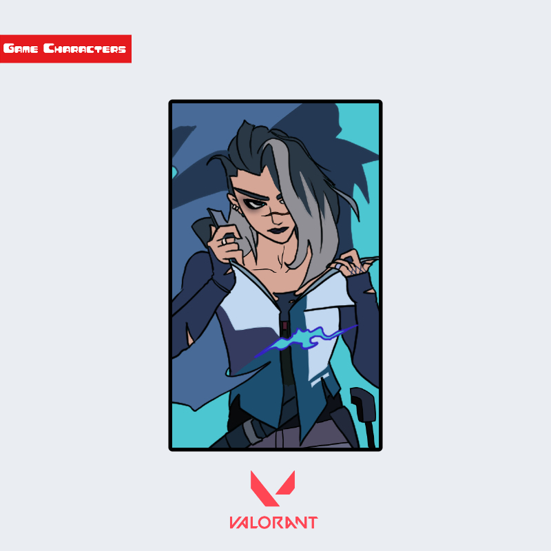 『VALORANT』に登場するフェイドは、闇を象徴する意匠を取り入れた戦術衣装構造を持つキャラクターである。髪は黒から灰色へとグラデーションし、左側が大きく垂れ下がる非対称構成となっている。上半身は黒と紫のコントラストを基調としたジャケットで、胸元には光を帯びたエネルギーラインが確認できる。肩や袖口に鋭角的なデザインが施され、全体として陰影の強い構築的な造形が特徴。構造分類としては「闇象徴型戦術衣装構造」に分類される。