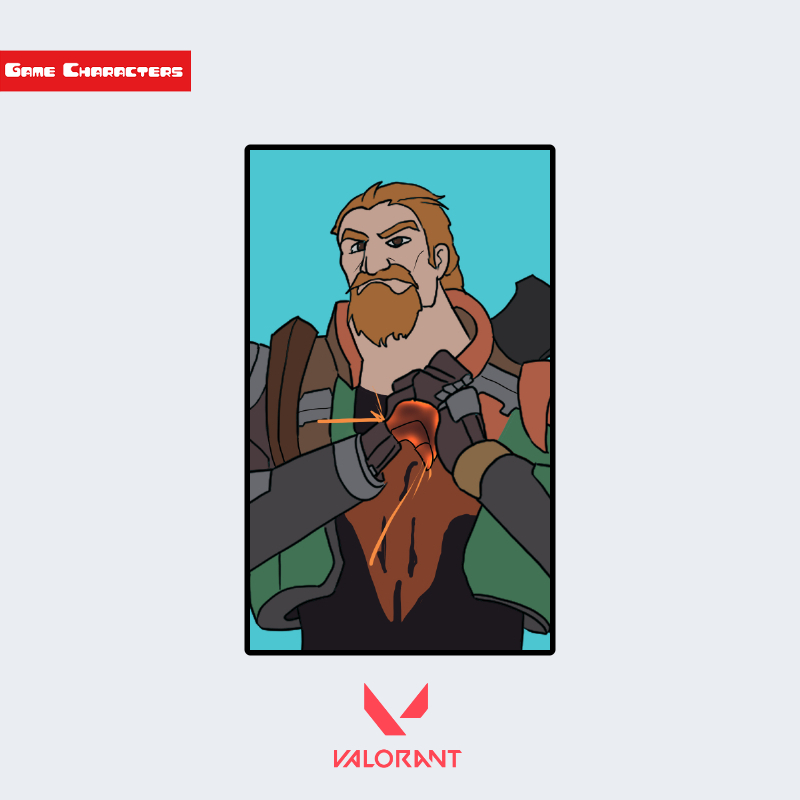 『VALORANT』に登場するブリーチは、機械義肢を主体とした重装戦闘構造のキャラクターである。髪と髭は赤みを帯びたブロンドで、力強い輪郭を際立たせている。上半身は防弾仕様のベストに加え、両腕に機械的な強化装備が施されており、内部の発光パーツが視覚的アクセントとなっている。衣装全体は耐久性を重視した素材構成で、力学的補助を前提とする構造設計が見られる。構造分類としては「重装義肢融合型戦闘構造」に分類される。