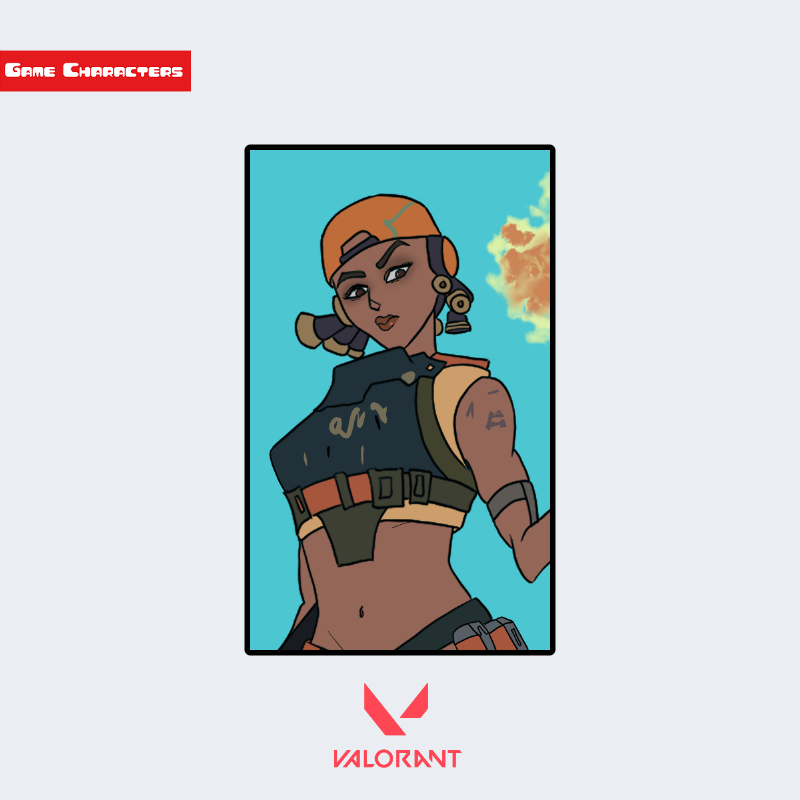 『VALORANT』に登場するレイズは、爆発系ガジェットを象徴するストリートミリタリー構造のキャラクターである。髪はオレンジのバンダナでまとめられ、活動的な印象を与えるショートスタイル。上半身はダークグリーンの戦闘トップスで構成され、肩や胸部には機能的な装備が取り付けられている。ベルトやアクセサリー類はカラフルな要素を含み、技術系デザインの中にポップさを持たせている。構造分類としては「ストリート融合型爆発技術装備構造」に分類される。