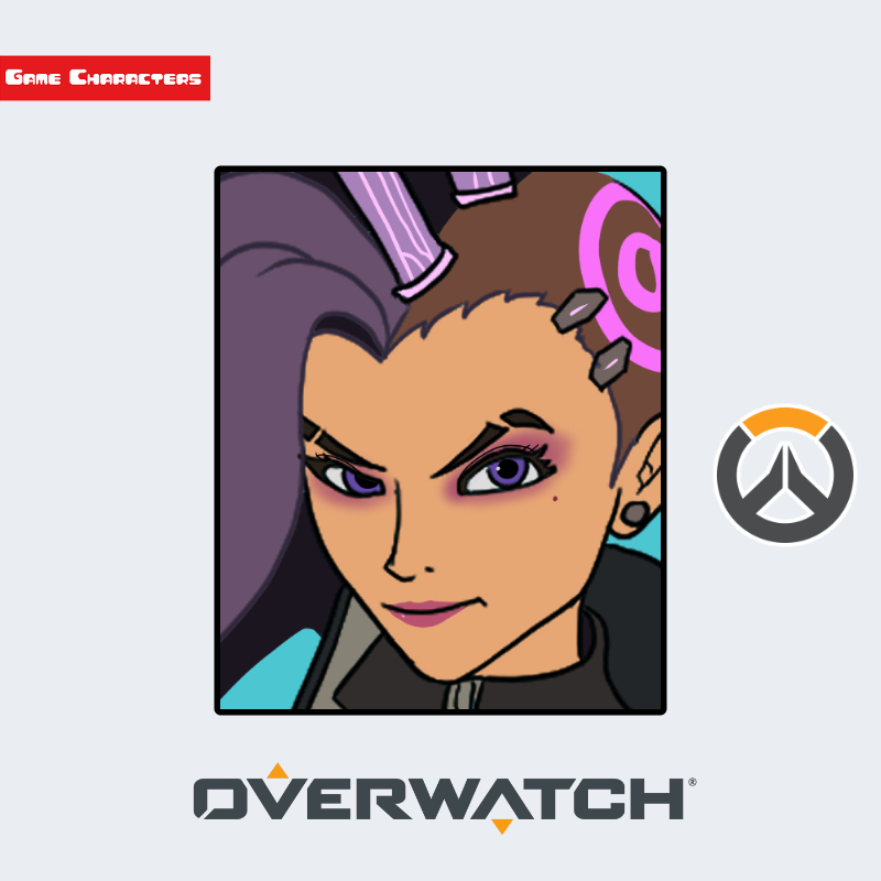 『オーバーウォッチ』に登場するソンブラは、紫系の髪色とサイドを刈り上げた非対称ヘアスタイルが特徴的な女性キャラクターである。髪には幾何学的な装飾ラインが入り、サイバーパンク的な造形要素が際立つ。目元は鋭く、紫色のアイシャドウが印象的で、全体として冷静さと精密さを象徴するデザインとなっている。衣装は近未来的なスーツ系統で、テクノロジーとの融合を示す構造を持つ。これらの特徴から「電子融合型構造」に分類される。