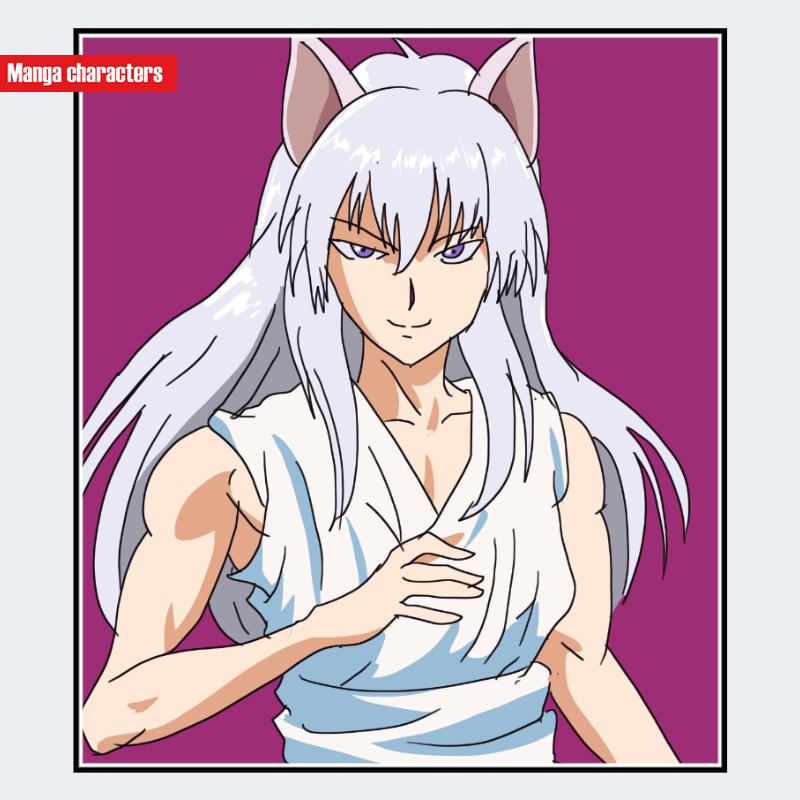 『幽☆遊☆白書』に登場する蔵馬(くらま)は、長く滑らかに伸びた銀白色の髪を持つ「長髪ストレート型」の髪構造が最大の識別要素となっている。前髪は細い束が顔周りに沿って落ちる配置で、側頭部から背中にかけて流れる髪がシルエットに大きな比重を持つ。瞳は青紫系で、強い描線の虹彩が高い視覚的存在感を与えている。衣装は白系のノースリーブ上衣で、身体の線をそのまま見せる「簡素外装型」の造りであり、肩や胸元の露出度が高いデザインとなっている。長髪の流線と細身の体躯が作品内でも際立つ特徴である。