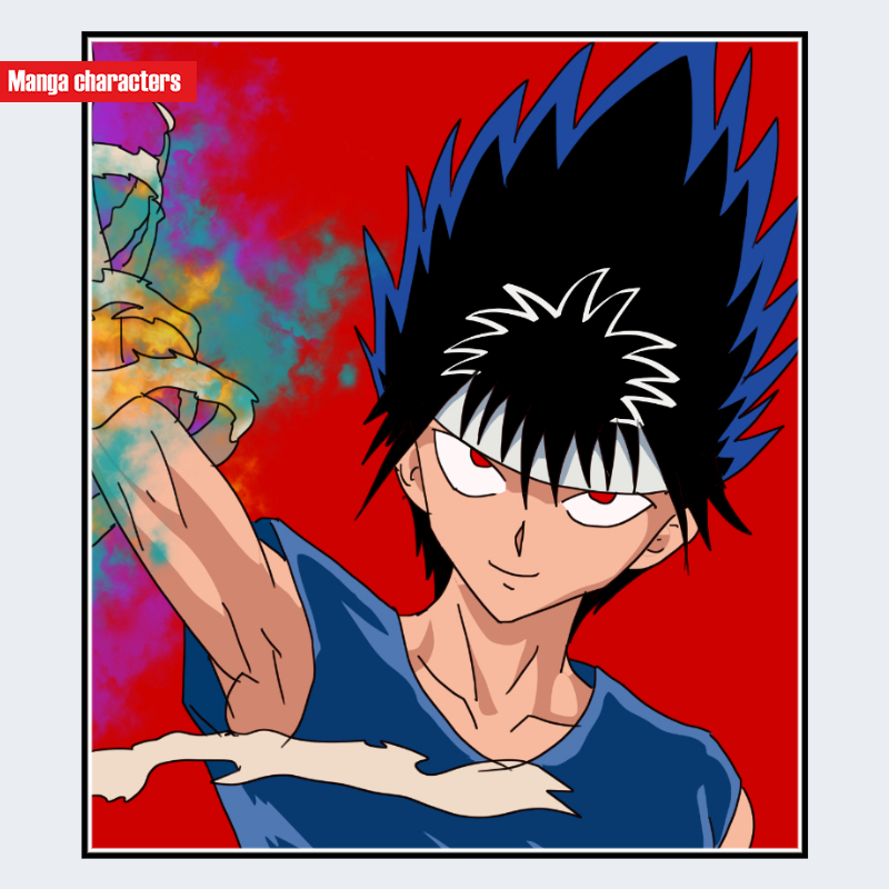『幽☆遊☆白書』に登場する飛影(ひえい)は、黒髪を上方向へ大きく逆立てた「上方スパイク型」の髪構造が最も強い識別点となっている。髪の根元から白色のアクセントが入り、二層の彩色構造がシルエットを際立たせている。瞳は赤系で、虹彩の外縁に強度の高い描線が入り、眼光を鋭く見せるデザインとなっている。衣装は濃紺のノースリーブ上衣で、肩と胸部の可視性が高い「簡素外装型」の構造である。筋肉のラインと細身の体格が直線的な輪郭と組み合わさり、作品内でも非常に特徴的な外観を形成している。