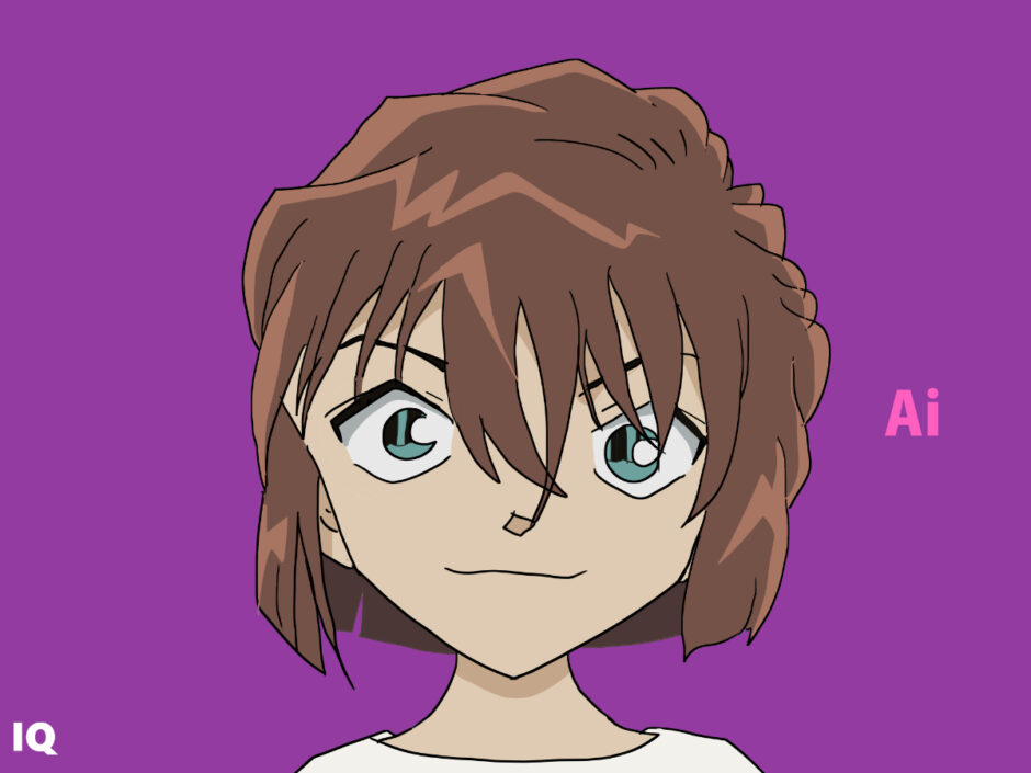 『名探偵コナン』に登場する灰原哀は、ブラウン寄りの赤茶色の髪を不規則にカットした「短髪ランダム束型」の構造を持ち、前髪は細い束が額と目元にかかる形で下ろされている。後頭部は丸みを保ったまま外側に軽く跳ねるシルエットで、頭頂から側面にかけての段階的な毛束が特徴的である。瞳は淡い青緑系で虹彩外周のラインが強めに描かれ、目元の陰影が視覚的な識別要素として機能する。体格は子ども体型の簡略シルエットで、輪郭線は細く抑えられている。
