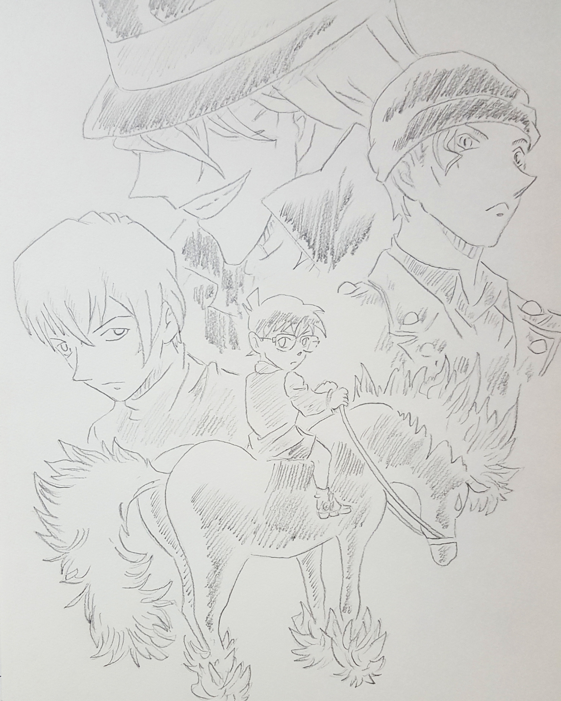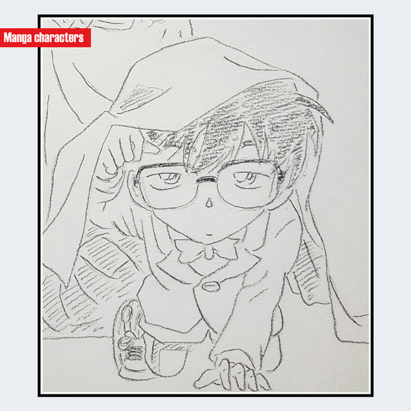 『名探偵コナン』に登場する江戸川コナンは、短く整えた黒髪を前方へ下ろした「前髪ショート束型」の髪構造を持ち、額から目元へかかる細い束の配列が特徴である。大きめの丸眼鏡フレームが外付け装飾として強く視認され、瞳は黒系で虹彩描線が簡素化されている。体格は小学生体型のデフォルメ寄りで、ジャケット・蝶ネクタイ・シャツを組み合わせた「制服融合型」の衣装構造となっている。線画では輪郭線が細く均質で、顔パーツの配置バランスが作品特有の記号体系として機能している。