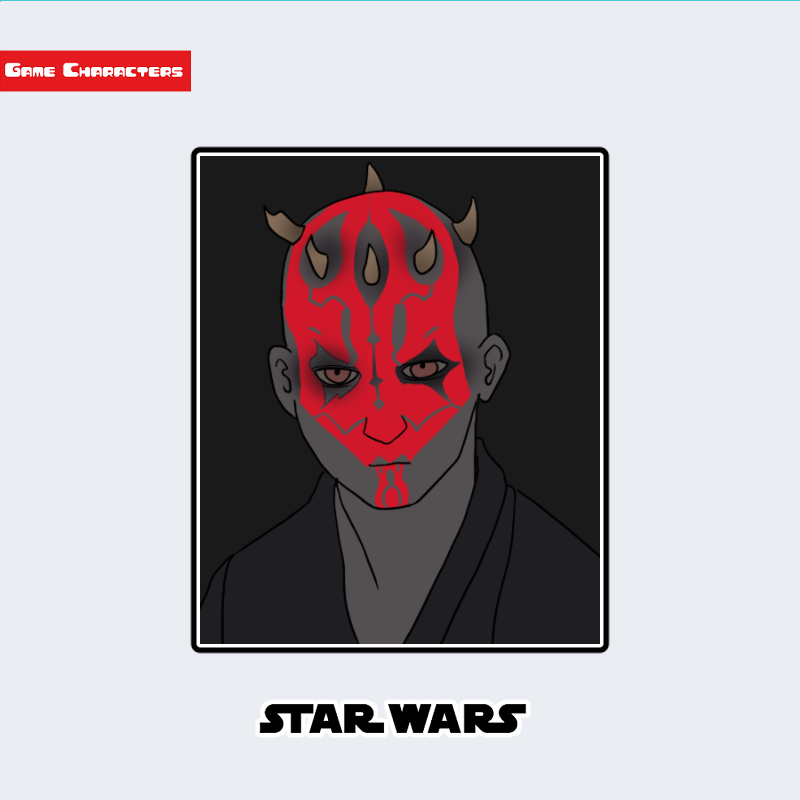 『スター・ウォーズ』に登場するダース・モールは、赤と黒の模様で覆われた顔面を持つ人型キャラクターである。頭部には短い角状の突起が複数生えており、額から後頭部にかけて放射状に配置されている。目の周囲は黒く縁取られ、赤地との強いコントラストが際立つ。衣装は黒を基調としたローブで、首元までしっかりと覆う設計となっている。全体として「異形人型構造」に分類され、同シリーズの人間キャラに比べて頭部装飾と色彩の構造的対比が際立つ。