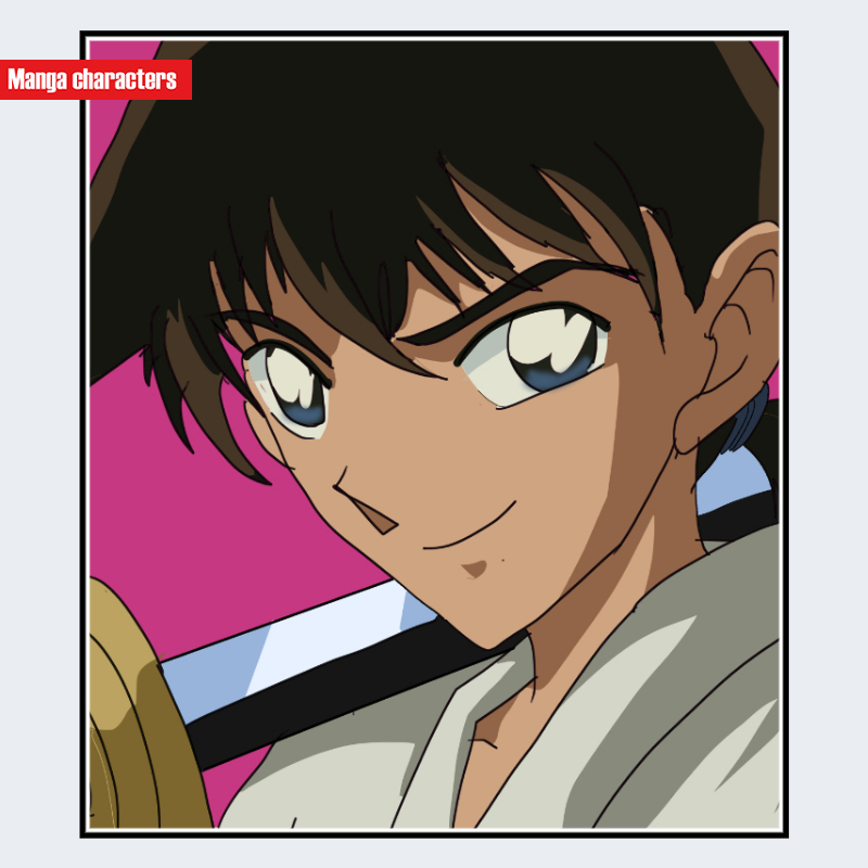 『名探偵コナン』に登場する沖田総司は、黒髪を後方へ流しつつ前髪を鋭く割った「後流れショート束型」の髪構造を持ち、目元にかかる細い束が左右非対称に配置されている。瞳は明るい水色系で、大きめの虹彩と強いハイライトが作品特有の輪郭強調として機能している。体格は細身の青年型で、首元から胸元にかけての衣装が白基調の上着で構成される「簡素外装型」。輪郭線は鋭く、特に顎・目元のラインが直線的に構成されている。