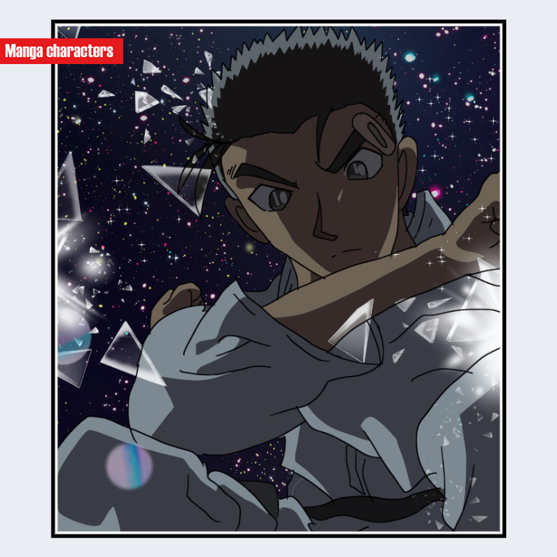 『名探偵コナン』に登場する京極真は、黒髪を強く立ち上げた「上方向スパイク型」の髪構造を持ち、額中央にかかる太めの一本束が特徴的である。上半身は白い道着で構成され、肩線・胸元のシワが大きく描かれる「武道外装型」の衣装構造となっている。体格は作中でも屈指の筋量を示す青年型で、腕・胸の筋線が道着越しに明瞭に強調されている。目元は鋭く、虹彩は暗色系で、瞳孔周囲が小さめに描かれる構造を持つ。