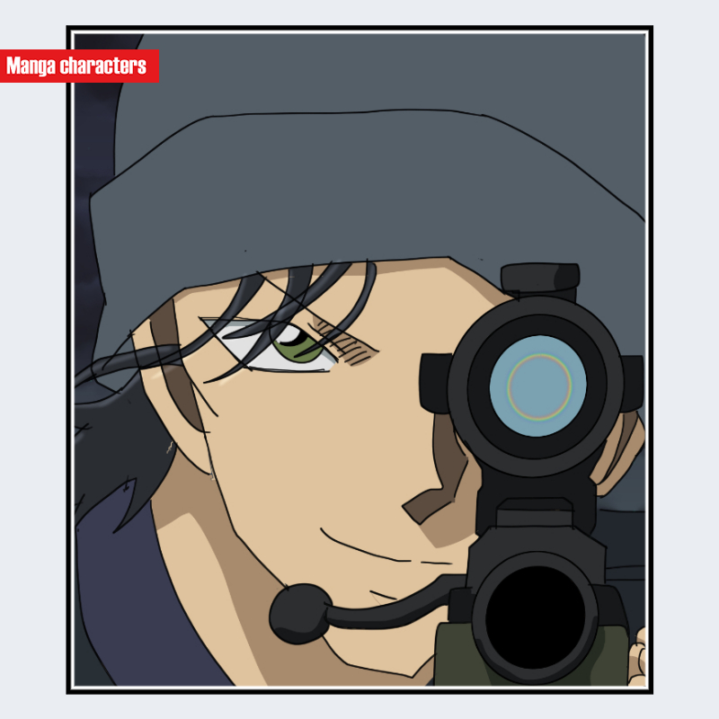 『名探偵コナン』に登場する赤井秀一は、つば広のダークカラー帽子と深い影が落ちる前髪構造を持つ「影強調型シルエット」のキャラクターデザインである。黒髪は長めの束が横方向へ流れ、頬にかかる左右非対称の前髪が特徴的。瞳は鋭い淡緑系で、虹彩の上部を影が覆う形の「半遮蔽型」。衣装はシンプルな濃色アウターで、肩から胸元にかけて直線的な外装線が強調される。スコープ越しの構えにより、腕と肩のラインが斜め方向に大きく張る姿勢構造が確認できる。