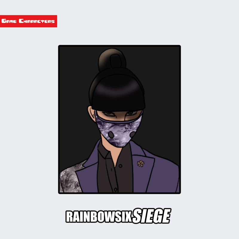 『レインボーシックスシージ』に登場するアザミは、和装要素と近代戦術装備を融合させた独自のスタイルを持つオペレーターである。画像では黒髪を高くまとめたシニヨン風の髪型が特徴で、顔の下半分を覆う布製マスクを着用している。衣装は紫系のスーツジャケットと黒のインナーを組み合わせ、片側の肩部分には模様的装飾が施されている。全体として「戦術礼装融合型」に分類され、都市戦と儀礼性の要素を兼ね備えた視覚設計となっている。