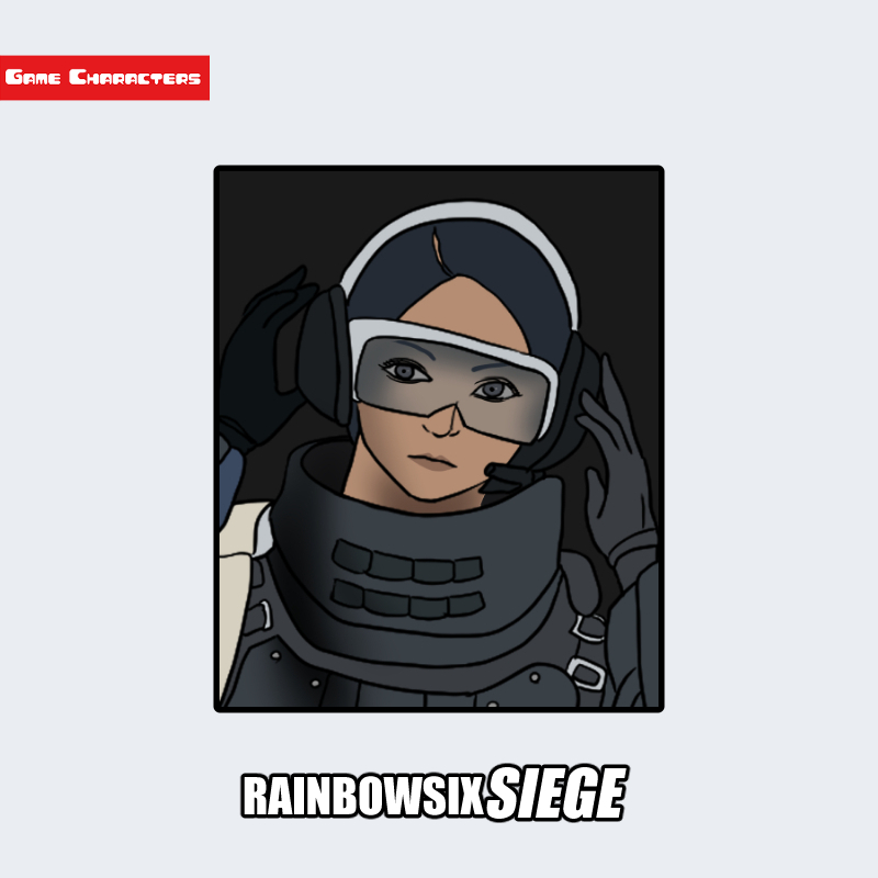 『レインボーシックスシージ』に登場するインは、高機動な突入戦術を特徴とするオペレーターである。画像では黒とグレーを基調とした装備を身にまとい、首元を覆う防護スーツと厚みのあるショルダーガードを装着している。頭部には黒いインナーキャップと透明なゴーグルを備え、顔の下半分を防護具で覆う構造となっている。全体として防御と視界確保を両立した「戦術突入装備型」に分類される。
