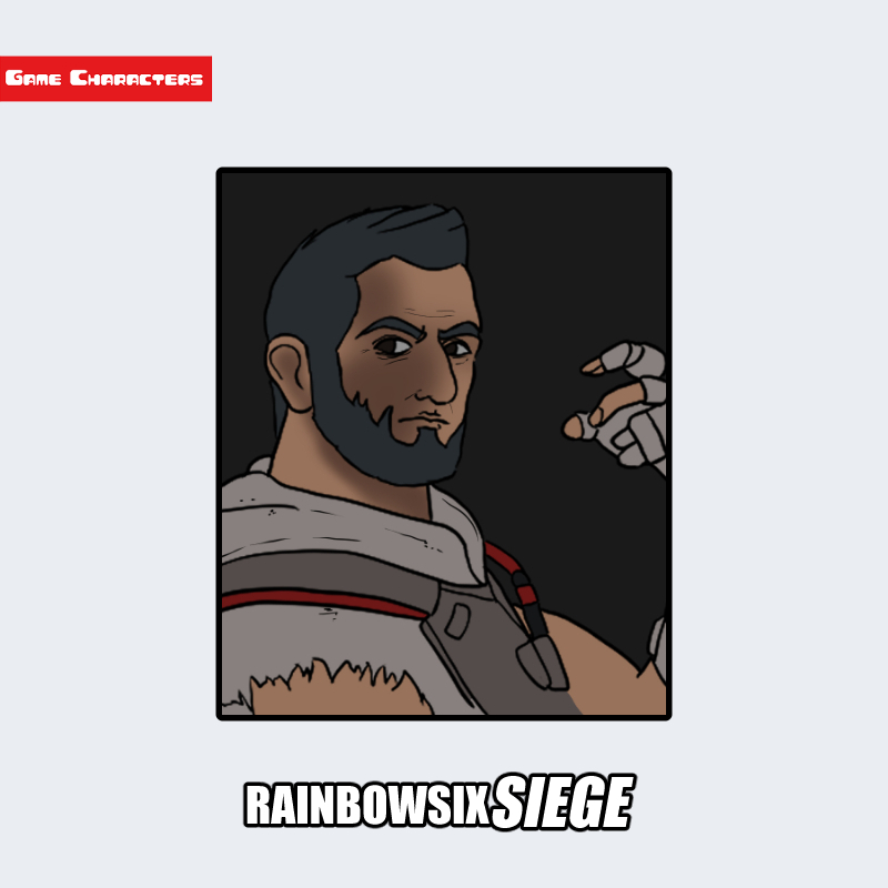 『レインボーシックスシージ』に登場するオリックスは、屈強な体格と近接戦闘向きの装備を持つオペレーターである。画像では短髪と整えられた髭を持ち、赤と白を基調とした軽装戦闘服を着用している。肩と胸部の防具は筋肉の動きを妨げない設計で、首元にはクッション状の保護材が見られる。手袋や腕部の補強材も実戦仕様であり、全体として「高機動重装融合型」の構造を持つ。