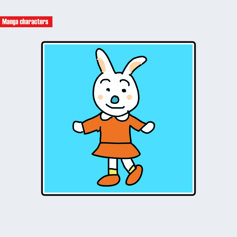『それいけ!アンパンマン』に登場するウサこは、白色を基調としたウサギ型の擬獣化デザインを持ち、頭部には縦長に伸びる左右の耳が配置されている。顔は丸みのある輪郭で、青い目とオレンジ色の鼻が視覚的なアクセントとなる。衣装はオレンジ色のワンピース型で、胸元と袖口に白い切り替えが入り、下半身には白いタイツが組み合わされている。足元は黄色い靴でまとめられ、配色の明度差が全体のシルエットを強調している。「擬獣化構造」に分類され、アンパンマン世界特有の動物型キャラの中でも、色調と衣装バランスによる識別性が高い。