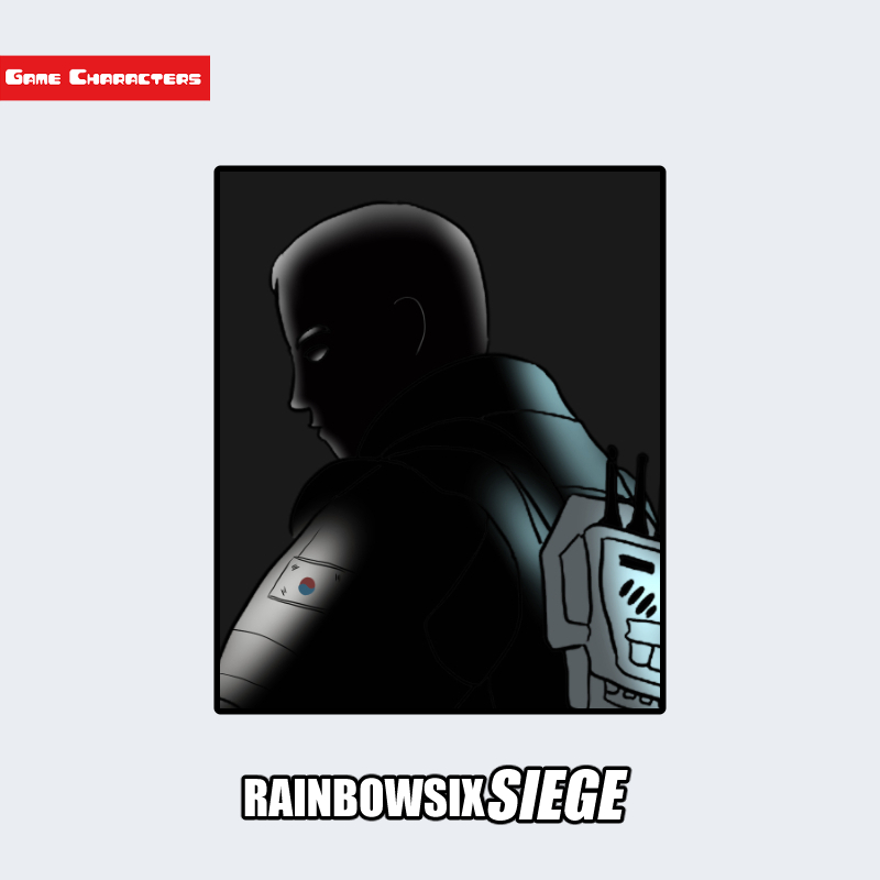 『レインボーシックスシージ』に登場するビジルは、電子迷彩技術を活用する防衛オペレーターである。画像では、黒を基調とした戦術スーツを着用し、頭部は露出した短髪スタイルとなっている。肩には通信装置とアンテナユニットを装備しており、背部の機械的構造が視認できる。全体として無線干渉やステルス機能を意識した設計で、「電子遮断戦術型」に分類される。光源を抑えた配色が機能的特性を強調している。