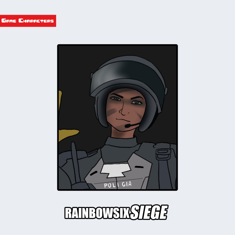 『レインボーシックスシージ』に登場するミラは、防御用装備を備えた戦術的オペレーターである。画像では、黒髪を短くまとめた状態で、重厚な防弾ヘルメットと防護ベストを着用している。頬には迷彩ペイントが施され、上半身の装備は実用性を重視した構造となっている。胸部には反射素材を用いたマークが配置され、視認性を確保しつつ階級や所属を象徴している。全体として「防御戦術型」に分類され、堅牢さと機能性を両立したデザインが特徴である。