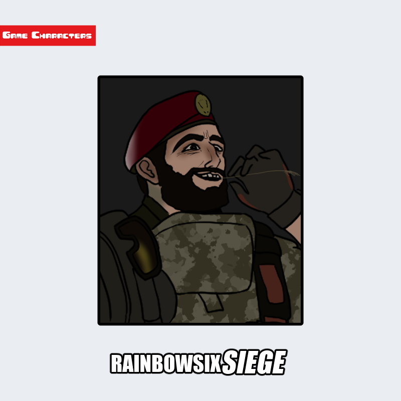 『レインボーシックスシージ』に登場するマエストロは、戦場での監視と制圧を目的とした装備を持つ防衛型オペレーターである。画像では、赤いベレー帽をかぶり、厚手の迷彩服と防弾ベストを着用している。顔には濃い髭を蓄え、表情は自信と冷静さを感じさせる構造をしている。胸部と肩部の装備は重量感があり、光学機器を操作する際の安定性を重視した設計と見られる。「重装観測型」に分類され、実戦的な装甲と指揮官的存在感を併せ持つデザインとなっている。