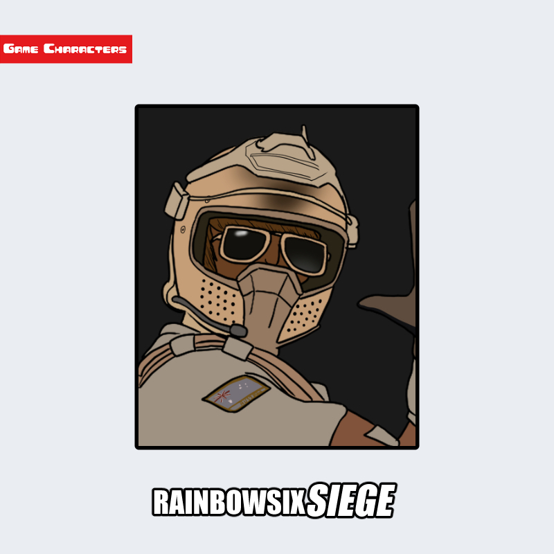『レインボーシックスシージ』に登場するモジーは、軽装ながら機能性を重視した防衛オペレーターである。画像では、砂漠色の戦闘服と防護ヘルメットを着用し、顔の大部分を覆う防塵マスクとゴーグルを装備している。ヘルメットには通信装置が組み込まれており、チーム間連携を前提とした設計が見られる。全体的に「機動防衛型」に分類され、機能的かつ俊敏な印象を与える構造である。腕や胸部の軽装備構造は、重量よりも運動性を優先したデザインを強調している。