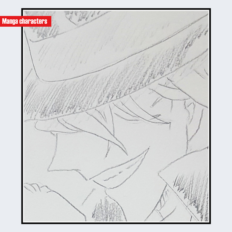 『名探偵コナン』に登場するジンは、長く直線的な輪郭線と、深く影を落とす帽子による「上部遮蔽シルエット」が特徴である。前髪は鋭角的で、左右に分かれながら帽子の縁へ向かって落ちる構造を持つ。顔の下半分は細い線で構成され、口元は斜線のみで示される「省略型の陰影表現」。首まわりには厚手の襟が見られ、視認範囲では肩幅が一定の幅で保たれる。全体的に直線主体で、上部に重心が集まる「上位重心型」の視覚構造で描かれている。