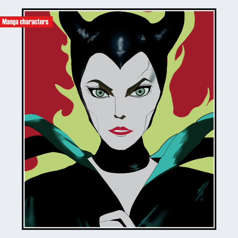 『マレフィセント』に登場するマレフィセントは、黒を基調とした頭部デザインと左右に鋭く張り出した角状シルエットを持つキャラクターである。顔立ちは白い肌と強調された頬のラインが特徴で、視覚的コントラストが非常に強い構造となっている。衣装は黒の外套に近い形状で、肩まわりに翼状のシルエットを伴う点が確認できる。全体の造形は「異形融合型」に分類され、人体ベースに象徴的モチーフ(角・翼状パーツ)が重ねられている。背景の炎状モチーフも含め、同作に見られるヴィラン系デザインの中でも尖鋭的な視覚階層を形成している。