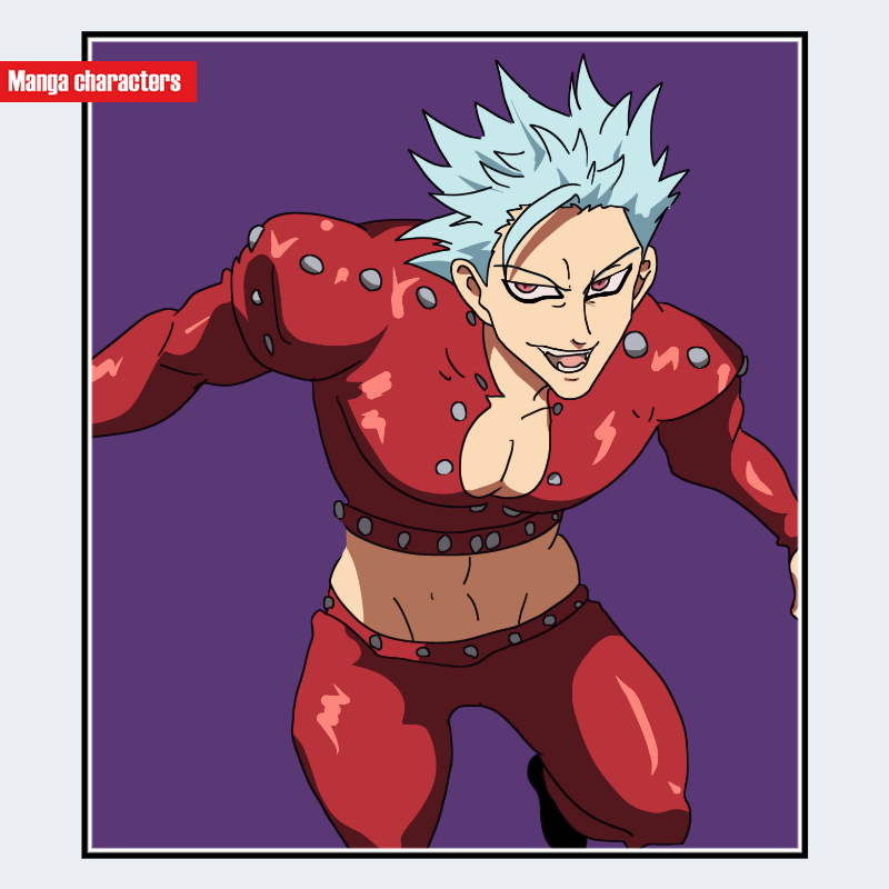 『七つの大罪』に登場するバンは、銀髪を逆立てた短髪と、上半身に密着する赤いレザースーツを着用している点が特徴である。衣装には金属スタッズが規則的に配置され、胸元が大きく開いた構造で身体のラインを強調する設計となっている。腹部には露出部があり、上半身のタイトな素材との対比で「装甲軽装型」の構造分類に該当する。袖や肩周りは丸みのあるパーツで構成されており、身体可動域を確保するデザインが認められる。同作の他キャラと比較すると、革素材を基調とした体表密着型の衣装は独自の視覚階層を形成している。