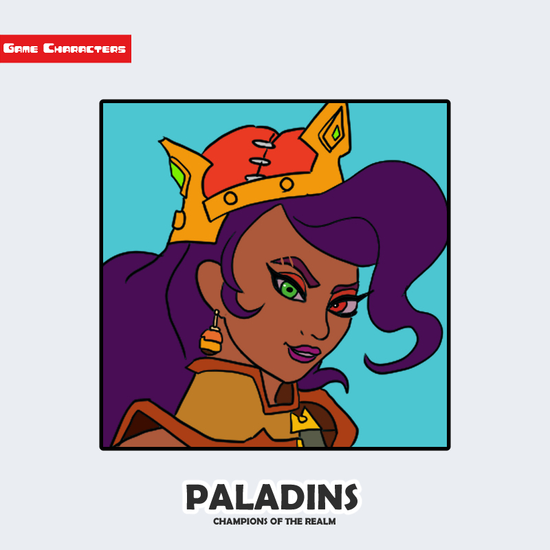 『Paladins』に登場するBetty-La-Bombaは、鮮やかな紫髪と金色の王冠状装飾を持つ人型キャラクターである。髪は大きく巻かれたポニーテール状にまとめられ、動きのあるシルエットを形成している。顔立ちはシャープで、赤と緑の対照的なアイメイクが強い視覚的アクセントとなっている。衣装には金属パーツや装飾的な肩部構造が確認でき、「爆発物擬人化構造」と「装飾戦士型」の要素を併せ持つデザインである。