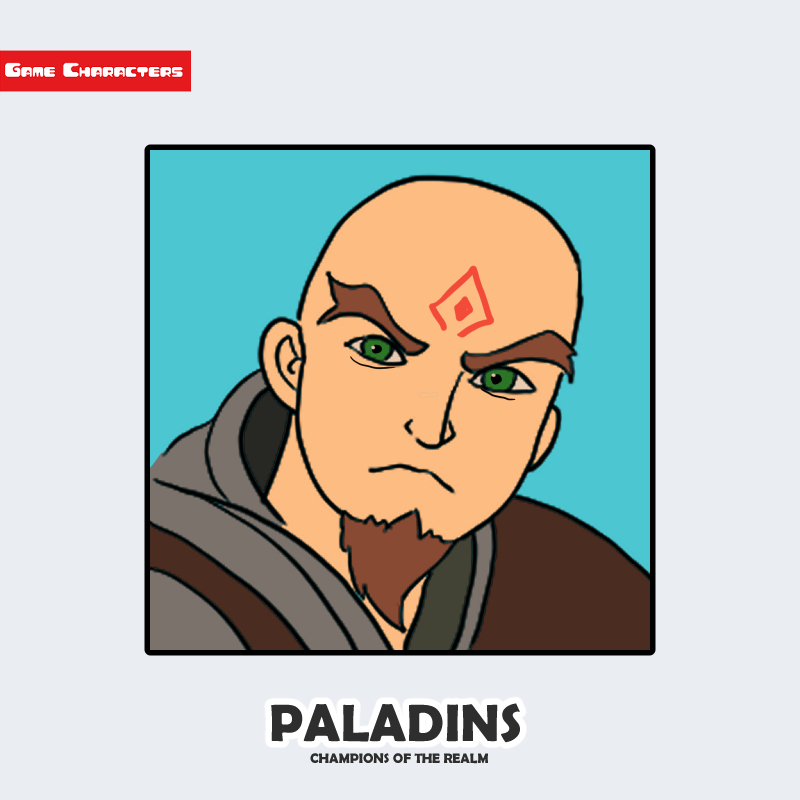 『Paladins』に登場するBuckは、筋肉質な体格を持つ人型キャラクターである。頭部は剃髪状態で、額には赤い紋章状のマーキングが確認できる。濃い眉と短い顎髭が輪郭を強調しており、戦士的な造形を際立たせている。肩から胸にかけては防具または皮革系装備を着用しており、実戦的な外観を構成している。構造的には「重装人型戦士」または「紋章装飾構造」に分類され、同作の機械装備型キャラとは異なる肉体主体のデザインである。