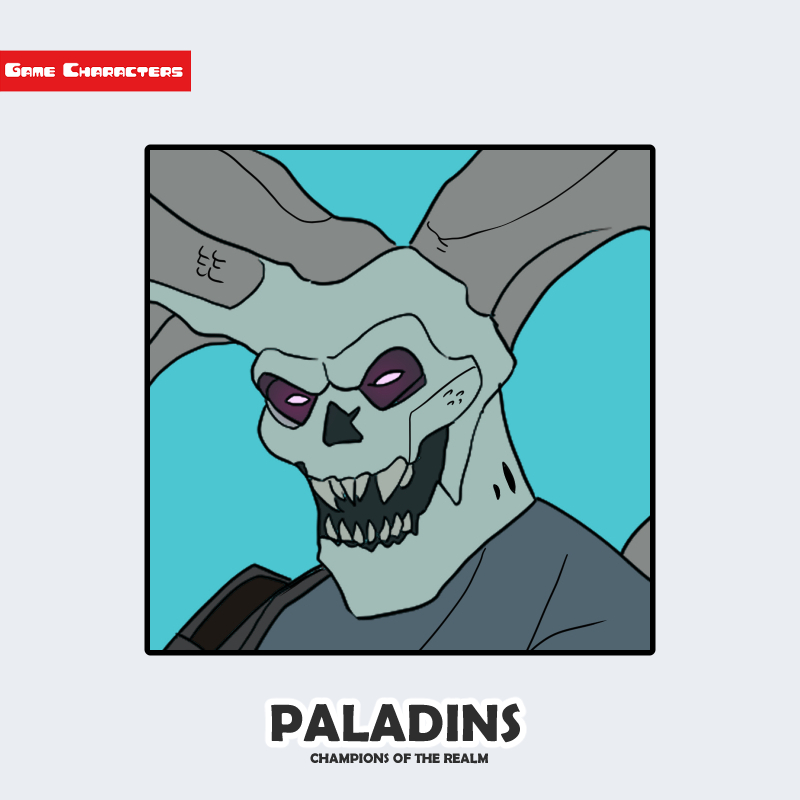 『Paladins』に登場するOmenは、頭部に大きな角と骨格的装飾を持つ骸骨型キャラクターである。顔の構造は生体要素を欠いた硬質な骨素材で形成され、眼窩には紫色の発光が確認できる。口部には鋭い歯が並び、下顎が開口状態で固定されている。全体的な体表構造は暗色系で、骨と装甲が融合したデザインとなっている。構造的には「骸骨戦士型」または「死霊融合構造」に分類される。