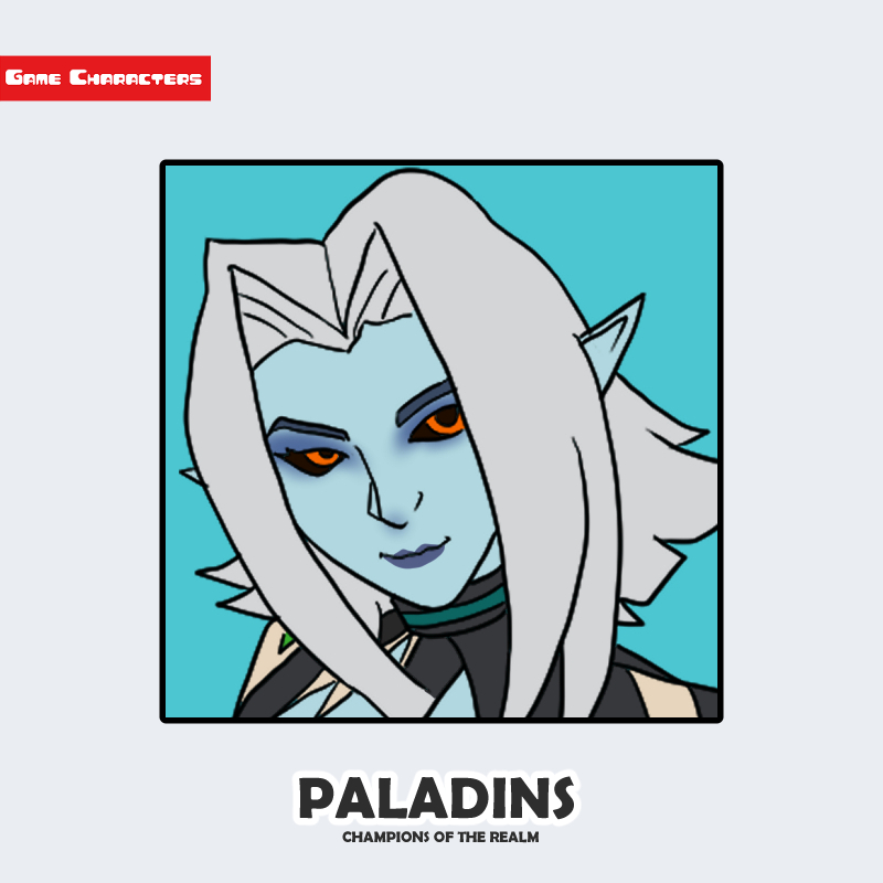 『Paladins』に登場するSaatiは、青みを帯びた肌と長い銀髪を持つ人型キャラクターである。髪は前方に流れるような構造で、全体的に滑らかで均整の取れた造形をしている。瞳はオレンジ色に発光しており、冷たい色調の肌との対比が強調されている。衣装は黒と白を基調とし、肩や胸元に金属的な装飾が見られる。構造的には「暗殺者型」または「冷色異種構造」に分類され、同作の暖色系戦士キャラと対照的な位置づけを持つ。