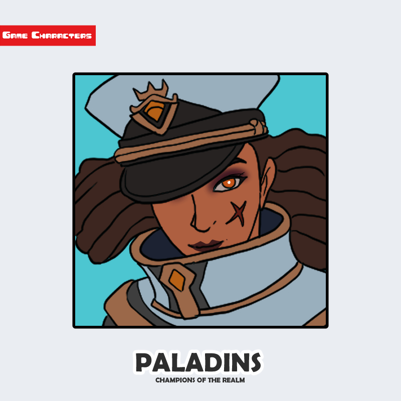 『Paladins』に登場するOctaviaは、軍服を基調とした衣装をまとう人型キャラクターである。黒を基調とした軍帽を斜めにかぶり、右頬には十字状の傷跡がある。衣装は灰色と青を組み合わせた制服構造で、首元には金色の装飾が確認できる。全体的に直線的で規律的なデザインを持ち、構造的には「軍装戦術型」または「指揮官構造」に分類される。同作の軽装・幻想系キャラとは異なり、実戦的な統率デザインに属する。