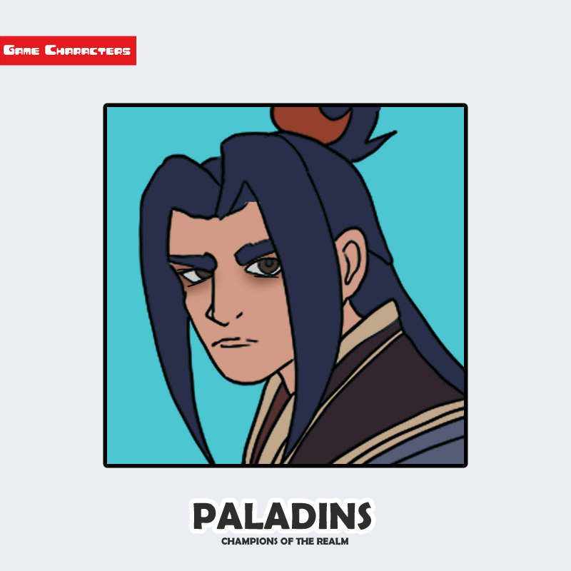 『Paladins』に登場するZhinは、長い黒髪を後方で束ねた人型キャラクターである。衣装は濃紺と金を基調とした和装風の構造で、肩や袖に装飾的な布地が確認できる。眉は太く、目元は鋭く整っており、全体的に冷静さと威圧感を併せ持つ造形となっている。腰元には帯状の構造があり、装備や武具を携える前提のデザインと見られる。構造的には「剣豪型」または「東洋戦士構造」に分類される。
