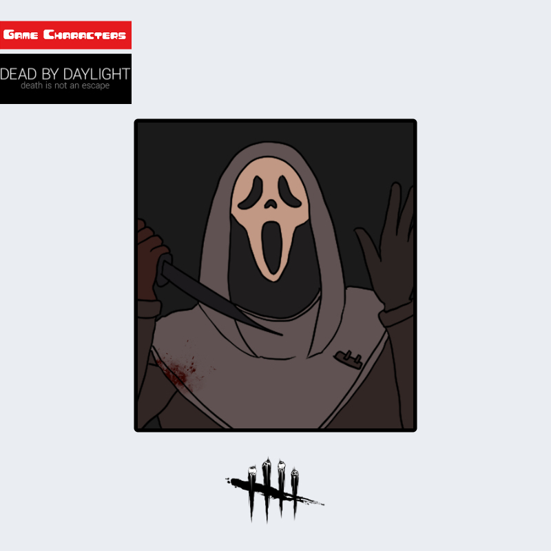 『Dead by Daylight』に登場するゴーストフェイスは、黒を基調としたフード付きローブをまとった人型キラーである。顔は白い仮面で覆われており、縦に長い口と黒い眼孔が強い対比を生んでいる。上半身には薄灰色の布を重ね、片手に血の付いたナイフを携える。フードとマスクによって人体の輪郭が単純化されており、「仮面覆面融合構造」に分類される。同作の他キラーと比べ、衣装全体の陰影が均質で、匿名性を強調する造形が特徴的である。