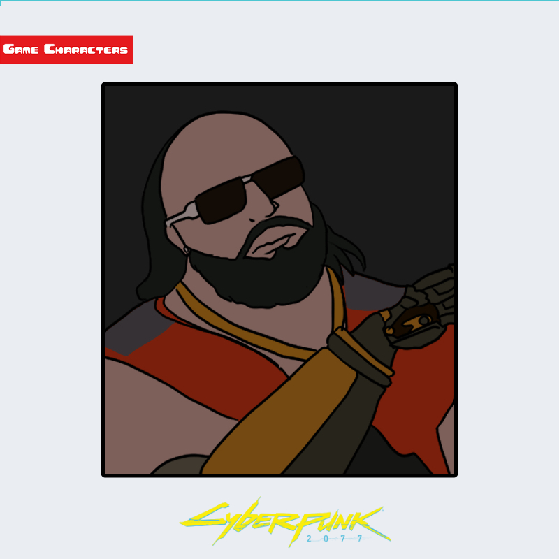 『サイバーパンク2077』に登場するデクスター・デションは、スキンヘッドと黒いサングラスが特徴的な大型体格の男性キャラクターである。顔には濃いヒゲを蓄え、首から胸にかけては金属製のチェーンが垂れ下がる。右腕は金属義肢に置き換えられており、指先まで精密に造形されたメカニカル構造が確認できる。衣装はオレンジ系のシャツに茶色のレザーベストを重ねた重装融合型スタイルで、上半身の質量感を強調する設計となっている。同作品内のVやジャッキー・ウェルズに比べ、義体外装の占有比率が高い。