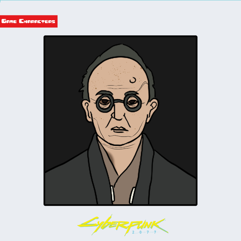 『サイバーパンク2077』に登場するサブロウ・アラサカは、頭頂部の髪が後退し、側頭部にわずかに残る短髪を持つ高齢の男性キャラクターである。顔には深い皺と落ち着いた表情が見られ、視覚補助装置として金属枠の円形義眼レンズが装着されている。衣装は黒を基調とした伝統的和装風の上着構造で、襟元の重ね縫いが精緻な仕立てを示している。全体的に外装義体化要素は少なく、精神的権威を象徴する無装飾融合型のデザインに分類される。同作品内の義体化が進んだ登場人物群と対比すると、人間的構造の保持が際立つ。