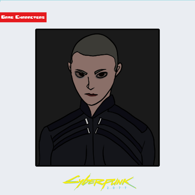 『サイバーパンク2077』に登場するT-バグは、短く刈り上げたヘアスタイルと無駄のない衣装構成が特徴のキャラクターである。髪は全体的に短く、頭部の形状を際立たせるミリタリースタイルに近い。上半身は黒を基調としたハイネックジャケットを着用し、胸元には水平ライン状の装飾構造が施されている。衣装素材は防弾性や機能性を意識したコンバットスーツ構造で、同作品内のローグ・アメンディアレスのような都市機能服よりも実戦的な設計である。全体として、重装義体融合型のサイバー戦闘向け衣装に分類される。