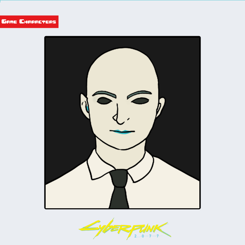 『サイバーパンク2077』に登場するデラマンは、完全な人工知能を象徴する人型インターフェースとして描かれている。頭髪を持たない滑らかな頭部と、無表情に近い白い皮膚構造が特徴である。瞳孔部分は黒く塗りつぶされたような人工視覚装置を備え、唇には淡い青の発光ラインが走っている。衣装は白のシャツに黒いネクタイという極めて整然とした構成で、人工的知性体の「擬人化デザイン構造」に分類される。他キャラクターに見られるサイバー義体化とは異なり、デラマンは完全な情報体としての外見的再現を意図している。