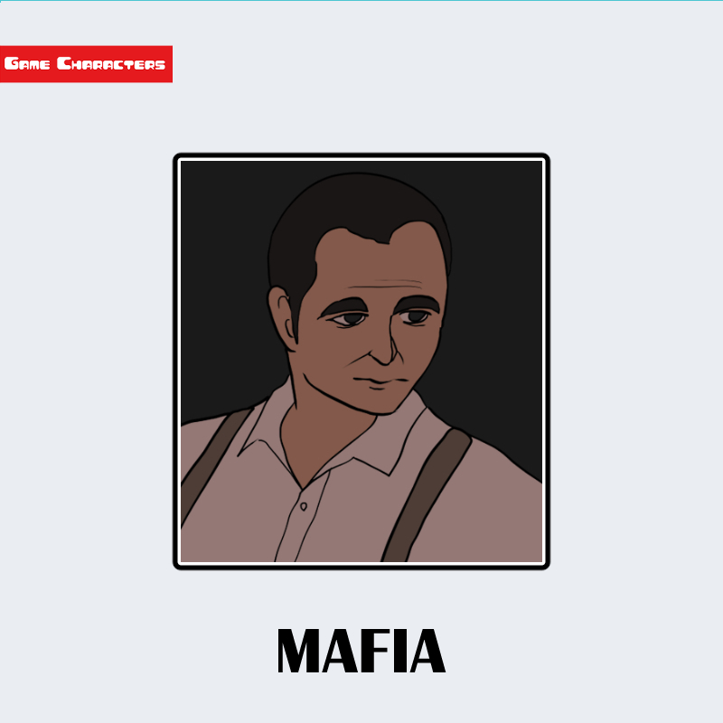『Mafia: The City of Lost Heaven』に登場するヴィンチェンツォは、短く刈り上げた黒髪と、額から後頭部にかけての滑らかなラインを持つ男性として描かれている。衣装は白いシャツに茶系のサスペンダーを合わせた構成で、上半身の装飾は最小限。襟元を開いたカジュアルな配置により、動作性を重視した「作業服融合型」の衣装構造に分類される。同作のトーマス・アンジェロのスーツ構造と対照的に、職人的・技術者的階層を表す造形が特徴である。