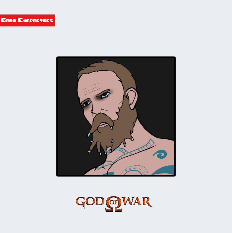 『ゴッド・オブ・ウォー』に登場するバルドルは、長めの髭と刺青を持つ男性型キャラクターである。髪は短く刈り込まれ、額から後頭部にかけて自然なラインを描く構造となっている。首から肩、胸部にかけては青い渦状の紋様が刻まれ、身体そのものが装飾的要素を兼ねている。衣装は最小限で、上半身の多くが露出しており、「紋様融合型構造」に分類される。クレイトスやデイモスと同系統の肉体構成だが、文様の意味構成が差異を生んでいる。