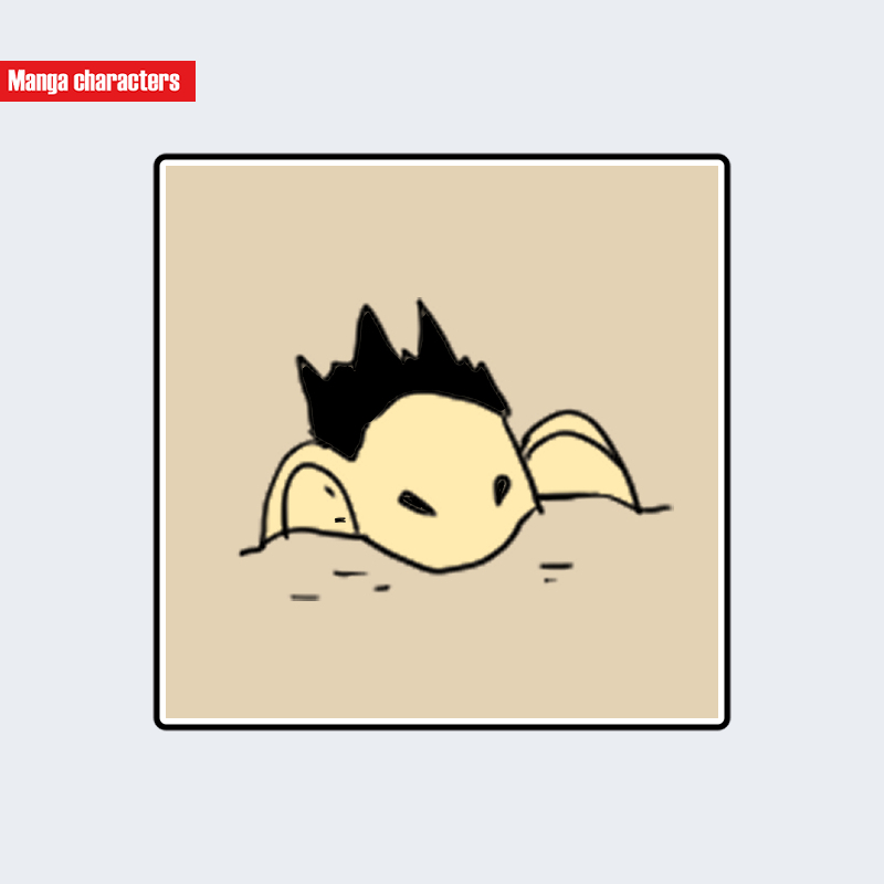 “mammoth” を字義通りに訳すと大型の牙を持つ写実的動物像を想起させるが、本作では “stylized mammoth figure” と補足すると構造的に誤解が起きない。跳ね上がる毛束は “upward jagged hair tuft” と表すと形状が明確になる。地面から上半身のみ覗く構図は “partially emerged body posture” などで説明できる。