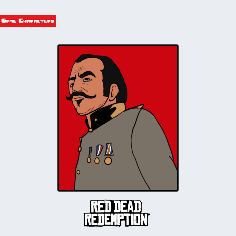 『レッド・デッド・リデンプション』に登場するアグスティン・アジェンデは、「軍装式権力構造」を持つキャラクターである。黒髪を後方へ撫で付け、太い口髭を整えた造形が特徴。濃灰の軍服には金ボタンと勲章が並び、視覚的に階級の高さを示すデザインとなっている。襟元は黒い立ち襟で構成され、軍規性と威厳を同時に象徴する。全体の造形は「指揮官階層融合型構造」として整理され、他の無法者的キャラとは明確に異なる秩序的衣装体系をもつ。