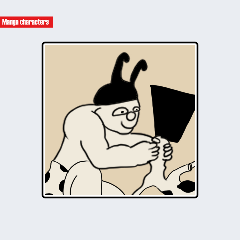 『珍助絵物語』に登場する珍助は、頭部に黒い二本の突起状パーツを載せた特徴的な造形で、前髪・角・帽子のいずれとも取れる形状が記号的にまとめられている。顔は丸みを帯びた輪郭で、目・鼻・口が最小限の線で構成された「簡略戯画型」に分類される。上半身は筋肉量を強調した太い腕で構成され、身体の量感を大きな面として扱う筆致が確認できる。手には台形状の黒い板を握っており、輪郭の尖りと身体の曲線が対照的に配置されている。同作に見られる造形の中でも、頭部パーツと筋肉の誇張が視覚階層の中心を形成している。