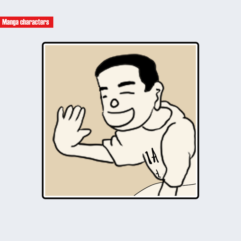 他の戯画系人物や浮世絵風キャラと混同されやすいが、黒く塗り分けられた髪型・丸い頬線・大きく開いた平手の三点が識別の要となる。