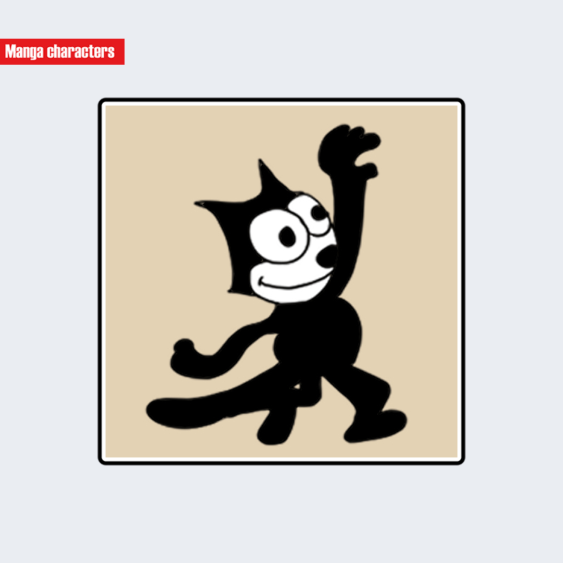 『フェリックスの初恋』に登場するフィリックス・ザ・キャットは、全身を黒い面でまとめ、白い大きな眼と口元のみを輪郭線で示した「擬獣化デフォルメ型」の造形である。頭部は丸みを帯びつつも上部に二つの耳状突起が立ち上がり、身体は細い四肢としなやかな曲線で構成されている。目は白目部分が非常に大きく、黒い瞳は中央よりやや内側に寄る配置で、表情の視覚中心を形成する。腕は大きく広げられ、動勢を示す伸びやかなシルエットが特徴である。黒い身体面と白い顔パーツの強い対比が、作品特有の視覚階層の核となっている。