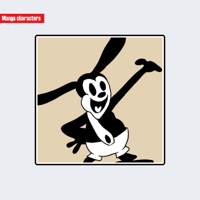 『トロリー・トラブルズ』に登場するオズワルドは、長くしなやかに伸びた耳を左右へ大きく広げた造形が特徴である。頭部は白い丸面に黒い輪郭で構成され、目は白目を広く取り黒い瞳を中央に寄せた「擬獣化デフォルメ型」の構造となっている。胴体と四肢は黒い大きな面として処理され、腕と脚は曲線主体で、動勢を強調する伸びやかなポーズが可視範囲の中心要素を形成する。腰には白い短パン状のパーツが配置され、黒い身体面とのコントラストが視覚階層の区切りとして機能している。全体として、耳の長大さと白黒の強い配色対比が造形の核となっている。