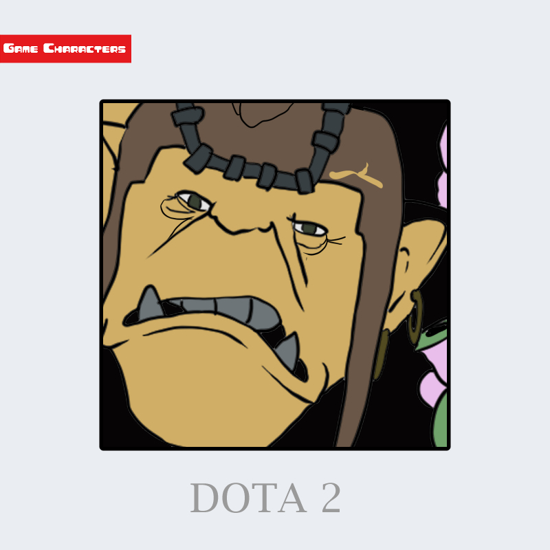 『Dota 2』に登場するアルケミストは、黄色みを帯びた肌と筋肉質な体格を持つ人型キャラクターである。頭部には茶色の革帯のような装飾が巻かれ、複数の金属パーツが接合された簡易的な装具が確認できる。顔の造形は粗野で、顎が張り出し、目の周囲に深い皺が刻まれている。歯がむき出しになった口元や大きな鼻の形状から、種族的に人間よりもオークやトロルに近い印象を持つ「錬成戦士構造」に分類される。同作の人間型キャラクター(例:インヴォーカー)と比べ、より物理的かつ実務的な造形が採用されている。