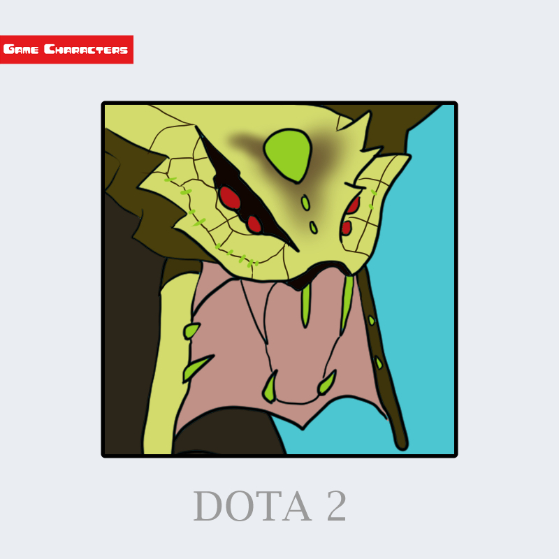 『Dota 2』に登場するウェノマンサーは、黄緑色の外殻を持つ爬虫類的存在である。頭部は鋭角的な形状で、額から口元にかけて亀裂状の模様が走り、赤い複眼が左右に配置されている。口の内部には牙が複数見られ、下顎には薄膜状の皮膚構造が展開している。身体表面は鱗に似た硬質素材で覆われ、滑らかな体表を持つ他キャラとは異なる「毒腺外殻構造」に分類される。同作品内では有機体的特徴が最も顕著な存在群に属する。