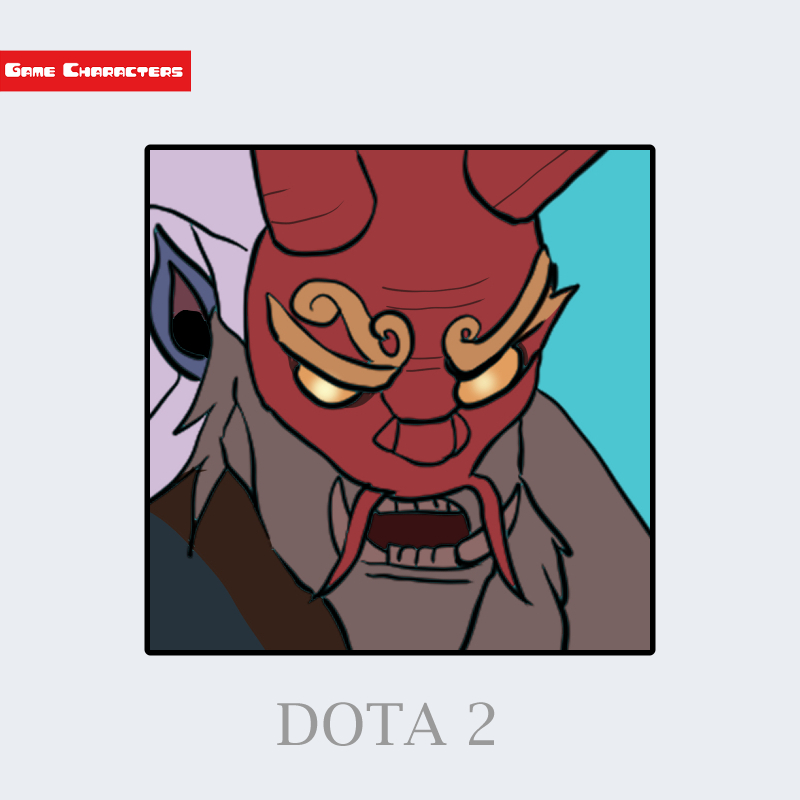 『Dota 2』に登場するグリムストロークは、芸術と呪術を融合させた意匠を持つ人型キャラクターである。顔には赤い仮面が装着され、金色の眉飾りと牙状の装飾が強調されている。仮面の下からは灰色の髭が伸び、衣装は濃色の布地を基調とした重厚な構成を持つ。頭部には角状の突起が見られ、装飾的でありながらも威圧的な構造。「呪術芸師型構造」に分類され、伝統芸術と悪魔的造形を融合させたデザインが特徴的である。